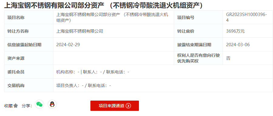 2024年2月29日,上海寶鋼不銹鋼有限公司以底價3696萬元轉讓不銹鋼冷帶酸洗退火機組資產。