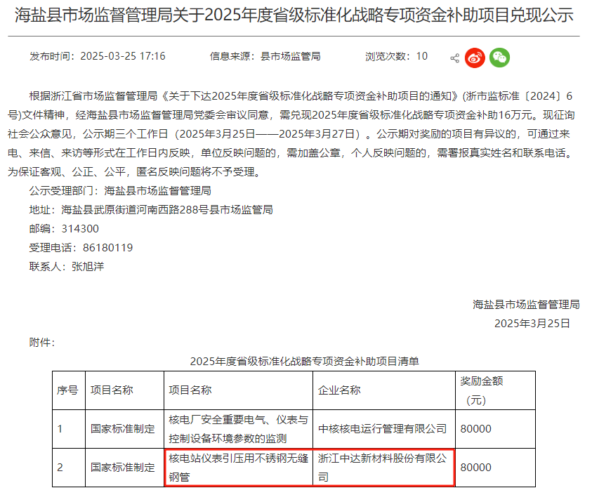 浙江中達新材料核電站儀表引壓用不銹鋼無縫鋼管項目獲8萬元獎勵