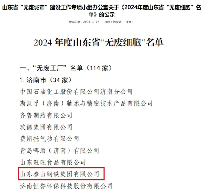11月7日,山東省生態環境廳公布2024年度山東省“無廢細胞”名單,泰山鋼鐵集團獲評首批省級“無廢工廠”。